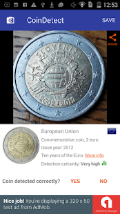 Descriptions : CoinDetect makes it easier to recognize euro coins. Just take a picture of a euro coin with your phone camera and the app will show you the country of origin, the year of issue and other information about the coin. Must have tool for every coin collector and numismatist!