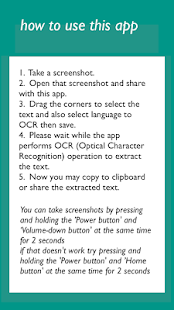 Descriptions : Default long press to copy text on mobile screen does not work. Sometimes this app helps you extract text / words from mobile screen just by sharing your screenshot with this app.
