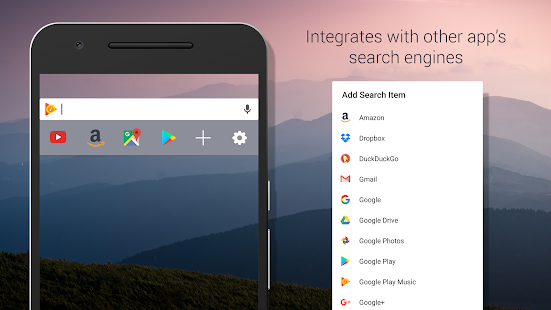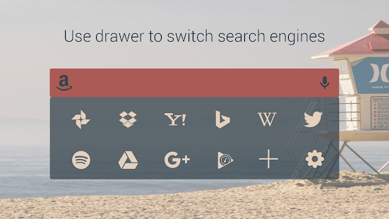 + Switch between search engines or apps like Play Music, Spotify, Wikipedia, Amazon, etc.