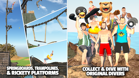 * Simple Controls - In this game, the controls are as simple as possible. You just have to tap the screen accordingly. First, you need to press and hold anywhere on the screen. Then you can release it to start your jump. Then you have to press and hold to stow. Then just let go to straighten. It's that easy to perform tricks in flip diving. You just have to control when you let go so you can make a perfect dive every time. But if you want to change the dive trick and character, just tap the options at the bottom of the screen.