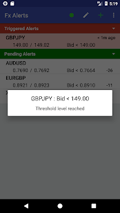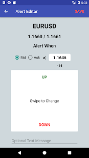Forex price alarm triggers can be set for the bid or ask price. Uses Google's messaging service. The app doesn't need to be running to receive a notification.