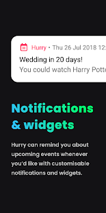 Descriptions : Hurry is a tiny app for big moments. Countdown of days, minutes and seconds for each upcoming event. A party, a holiday or an upcoming concert? Sorted. Mark the days until Christmas? Stay tuned in no time with optional notifications / widgets and refreshing new gifs. Hurry contains widgets of all sizes with your home screen. Share it with your friends / family so they can join as well. You can repeat events and events directly from your calendar.