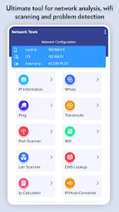 Descriptions : Network Tools: WiFi Analyzer, IP Utilities App is a combination of tools to help you understand your network configuration, WiFi status, possible problems, network availability and its performance.