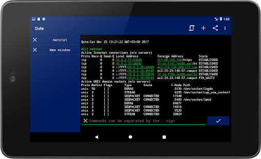 Descriptions : Get quick access to the built-in Unix command line shell from your Android device. You can use Qute as a command prompt to run Unix \ Linux commands, install bin files, and create shell scripts. The most common PC commands (ping, netstat, trace, cd, mkdir, etc.) are now available on your device. With Qute you have full access to the system terminal. Now you have total control of your system!