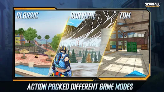 Featuring team deathmatch and solo deathmatch which you can play online with intense 4v4 squad OR duo. Play as a lone soldier OR with the clan to combat with rivals. Scarfall offers TPS (Third Person Shooter) and FPS (First Person Shooter) play with modern vehicles to roam around quickly and reach the final destination in the shrinking zone.