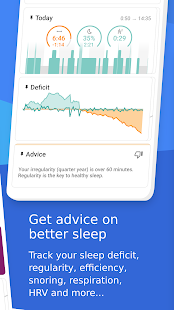 + Sleep assessment: Your sleep quality is made up of duration, deficit, deep sleep%, snoring, efficiency, irregularity