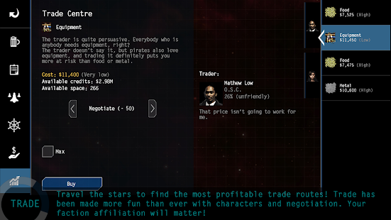 The first task you have to do in Space RPG 4 is to choose how to move and trade within the large space, since this will allow you to earn the necessary things and credits. At the same time, an interesting point about the mechanics of this game is the negotiation mechanism, where you try to offer different prices than the original price in order to save money. But that's not an easy task.