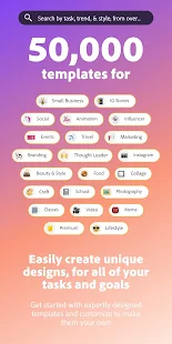 Descriptions : Get started in seconds with professionally designed templates that you can customize with just a few taps to create your own. Pick your images, add text to photos, and apply design filters to create stunning thumb-free graphics in no time. Discover new layouts, color palettes, typography styles or filters with a single tap. Promote your work and brand online and create flyers, ads, collages and invitations for free. Easily share your designs to delight your followers. Add flair to social media posts and enhance your Instagram stories with videos.