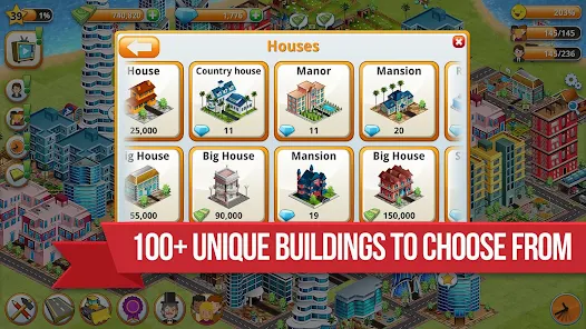 * Unlock and build from a list of 100+ unique buildings (residential, commercial, farm, community, decoration, park, plant, beach and sea buildings like oil platforms and more)