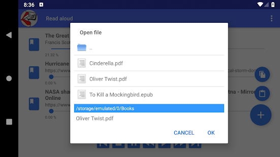 Simply enter any URL web address from your internet browser, paste text from the clipboard or open a file directly in the app. It supports many e-book and document formats like pdf, epub, txt, html, rtf, odt, docx.