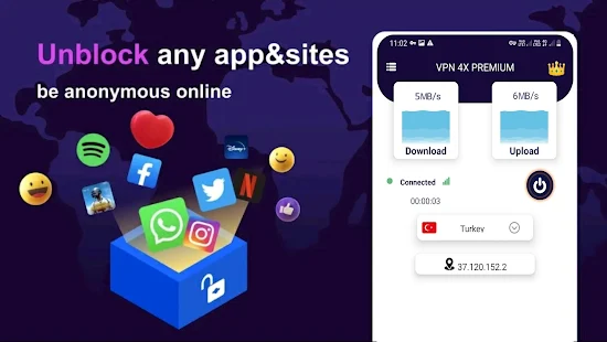 Descriptions : VPN 4x Premium is a free and anonymous high-speed VPN service that gives you access to all your favorite sites. With VPN 4x Premium on your Android device, you can protect your online privacy, stay anonymous on public WiFi, and stream whatever you want. Download VPN 4x Premium and enjoy internet freedom now!