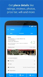 + Get useful information like: WiFi availability, accepts credit cards, takes reservations, has outdoor seating.